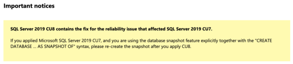 […] Case in point, just look at how buggy Cumulative Updates for SQL Server 2019 have been: Microsoft pushed out the 2019 CU7 only to soon remove it and push CU8 as a fix what CU7 had broken. […]